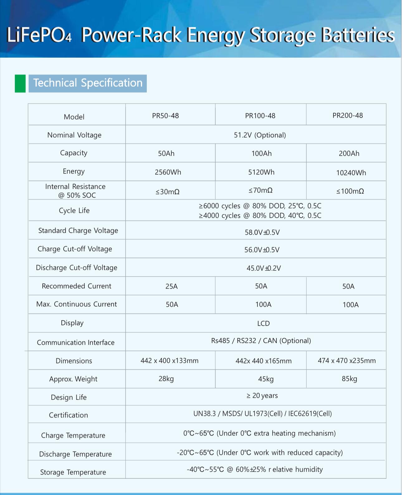 | Nominal Voltage | 48V (LFP-15 series) | 51.2V (LFP-16 series) |